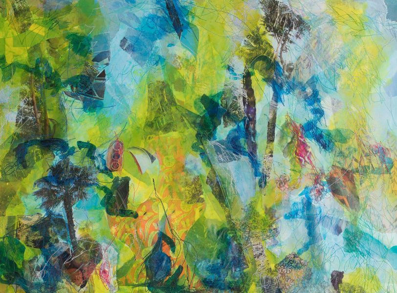 Vielschichtige, durch Maschinenstickerei texturierte Collagen mit großer Tiefenwirkung starken Farben und schrägem Witz. Die Arbeiten lassen die Betrachter eintauchen in fremde Welten, sie zeigen Sehnsuchtsorte und erschaffene Landschaften.